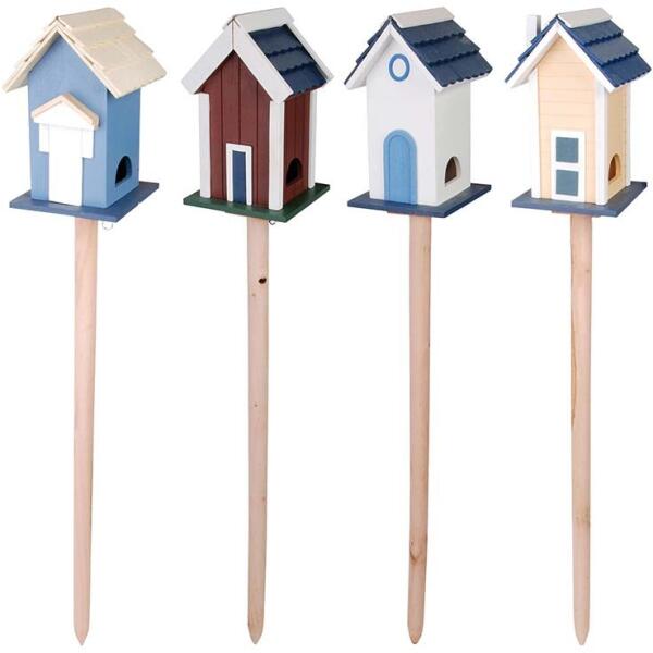 Fából készült madárház sárga színben. A kertünk bármely részére könnyen leszúrható és áthelyezhető. Esősebb időben a tető védelmet nyújt a madaraknak, a peremen pedig egyszerre több kismadár is megkapaszkodhat. Cserébe pedig a madarak gyönyörű csicsergéssel hálálják meg a gondoskodást.