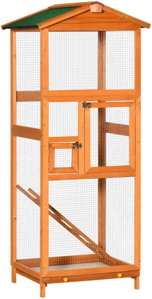 PawHut Kültéri Madárház fa tálcával - Biztonságos otthon kedvenceidnek ? Ez a PawHut madárház ideális választás, hogy biztonságos és kényelmes otthont teremts kedvenc madaraidnak a szabadban. A masszív szerkezet és a praktikus kialakítás révén a madarak védve vannak, miközben te könnyen gondoskodhatsz róluk. Főbb jellemzők:Masszív és tartós: Tömör fenyőfából készült a hosszú élettartam érdekében. Időjárásálló: A vízálló aszfalt tető és a kezelt faanyag védelmet nyújt az időjárás viszontagságai ellen. Biztonságos kialakítás: Erős drótháló védi a madarakat a ragadozóktól. Könnyű hozzáférés: 2 nagy elülső ajtó biztosítja a könnyű hozzáférést a madarakhoz és a belső térhez. Könnyű tisztítás: A kivehető alsó tálca gyors és egyszerű tisztítást tesz lehetővé. ? Tágas tér: Függőleges kialakítás sok madár számára ideális. Méretek:Méret ÉrtékTeljes méret 68cm x 63cm x 165 cmNagy ajtó mérete 31 x 41cmKis ajtó mérete 17,5 x 17,5cmTálca mérete 56 x 51,5cmTovábbi előnyök: A madárház narancssárga és zöld színkombinációja feldobja a kertet. A fa tálca megkönnyíti a takarítást és a madarak etetését. A stabil szerkezet biztosítja, hogy a madárház biztonságosan álljon a szabadban. Ez a PawHut madárház tökéletes választás, ha szeretnéd biztonságban és kényelemben tudni kedvenc madaraidat a szabadban. ?